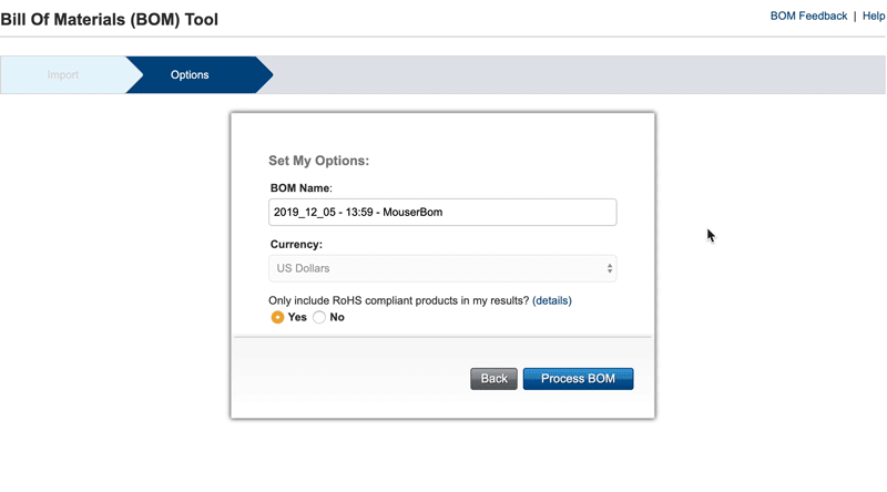 Once your options are finalised, Mouser's BOM Tool will begin matching the items in your BOM. The processing time may range from a few moments to several minutes based on the size of your BOM.